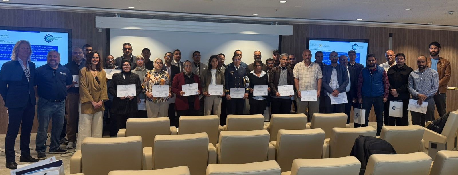 Le Cluster Industrie Navale du Maroc (CINM) a organisé avec succès le mardi 28 avril 2026 en partenariat avec l'Association des Armateurs du Maroc (ARMA) et la Chambre des Pêches Maritimes de l'Atlantique Nord (CPMAN) au nouveau Bâtiment Communautaire Portuaire de Casablanca, une formation sur le thème : le cordage d'amarrage : les spécifications techniques et les cas d’usages, pour la sécurité de la navigation et des opérations portuaires et qui a connu la participation de 56 participants représentants 16 organismes publics et privés du secteur maritime et portuaire et qui a été animée par des deux experts internationaux en la matière.