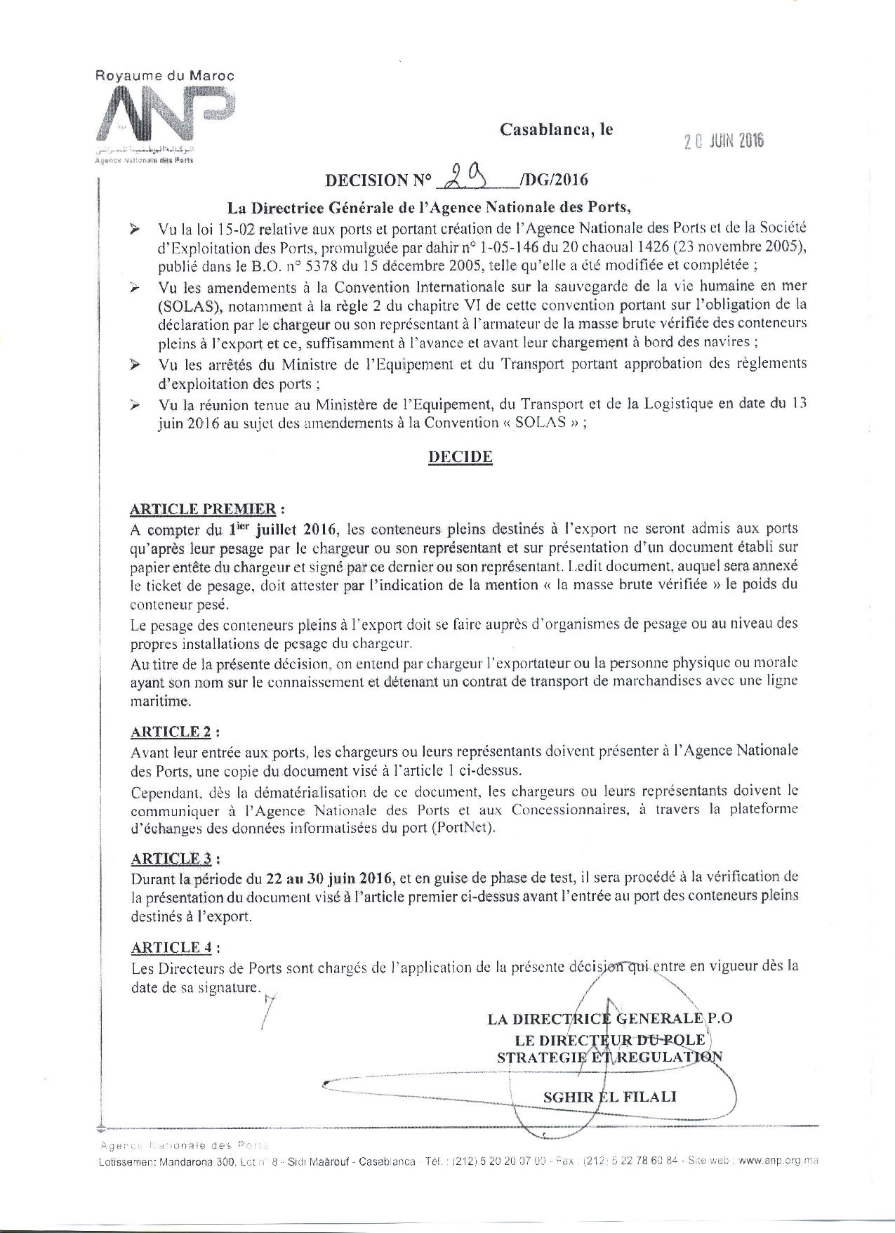 Veuillez trouver, ci-joint, la Décision ANP n° 29 du 20 juin 2016 relative au pesage obligatoire des conteneurs à l’exportation à compter du 1er juillet 2016 (Rentre dans le cadre de l’amendement à la Convention SOLAS).