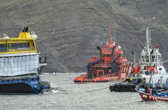 Des remorqueurs se préparent à récupérer le ferry Bentago Express de la compagnie norvégienne Fred Olsen, échoué près des quais d'Agaete à Gran Canaria, en Espagne, le 8 janvier 2021.