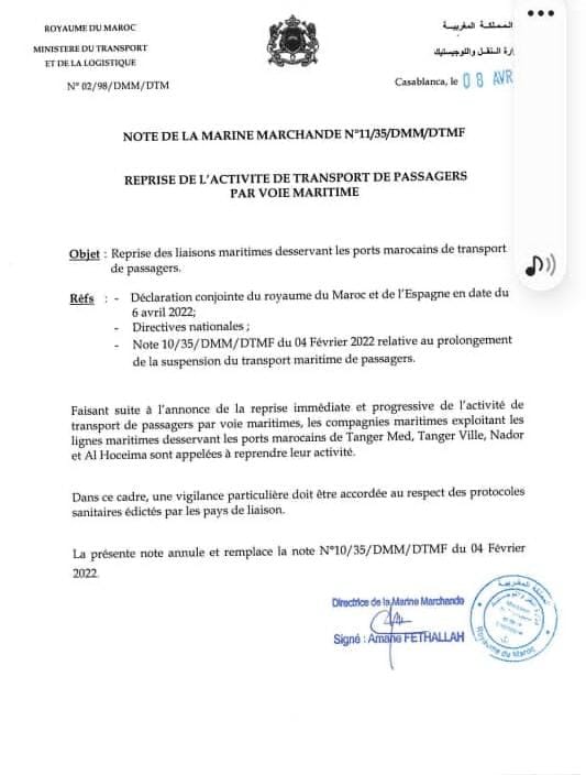 Faisant à l'annonce de la reprise immédiate et progressive de l'activité de transport de passagers par voie maritimes, les compagnies maritimes exploitant les lignes maritimes desservant les ports marocains de Tanger Med, Tanger Ville, Nador et Al Hoceima sont appelés à reprendre leurs activités.