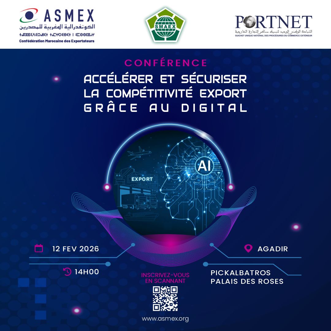 Dans un contexte où le digital et l’intelligence artificielle transforment en profondeur le commerce international, l’ASMEX – Confédération Marocaine des Exportateurs, en partenariat avec PORTNET, le Guichet Unique National des Procédures du Commerce Extérieur, et SMAEX SA, organise une conférence stratégique dédiée aux nouveaux leviers de performance à l’export.
