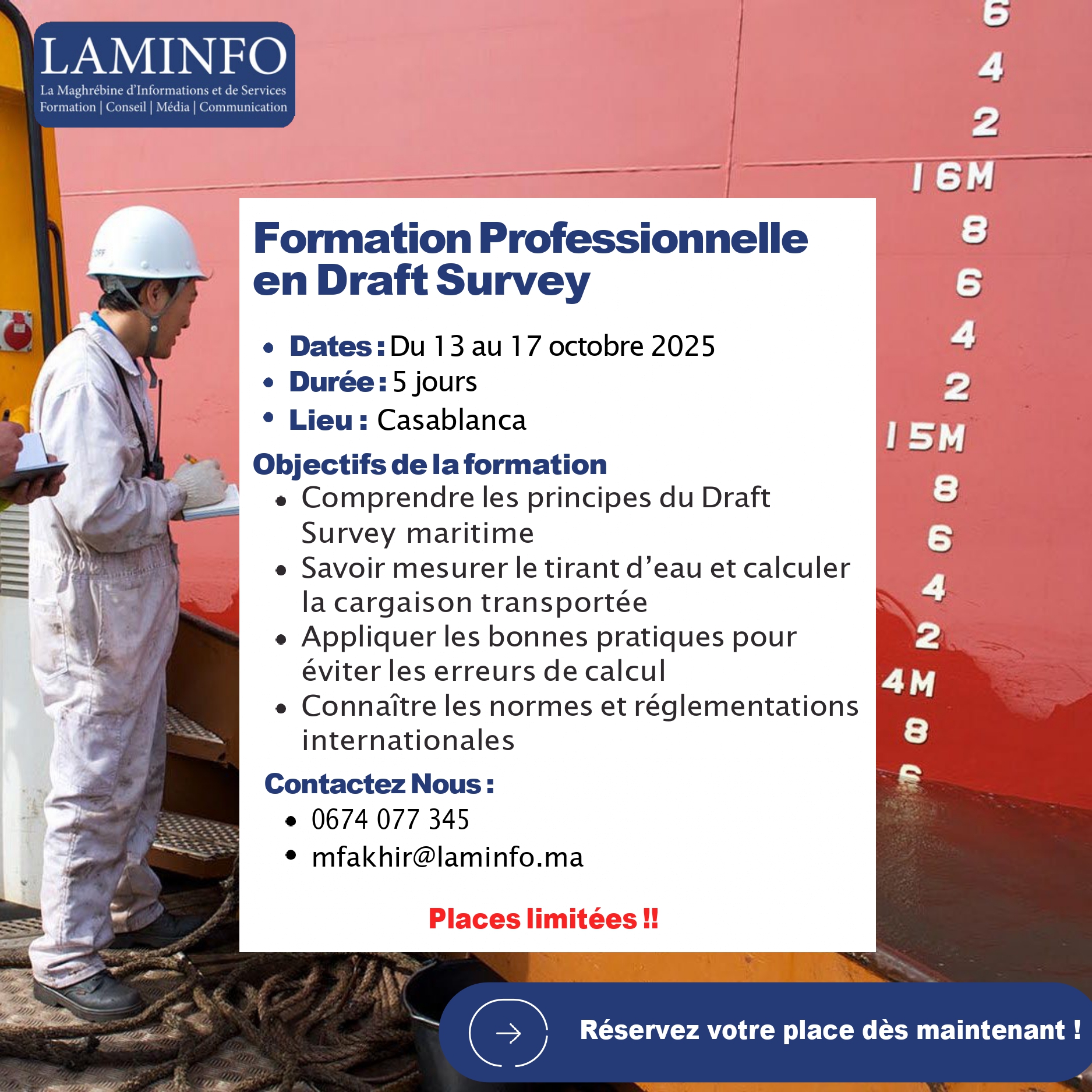 Dans le cadre de son engagement à renforcer les compétences dans le secteur maritime, le cabinet LAMINFO annonce l’organisation d’une formation professionnelle sur le Draft Survey, qui se tiendra du 13 au 17 octobre 2025 à Casablanca.