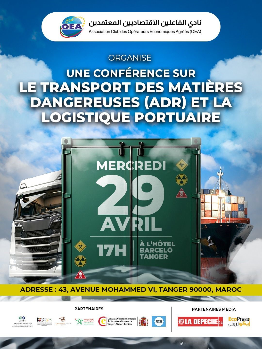 Dans le cadre de ses actions d’accompagnement et de sensibilisation, le Club des Opérateurs Économiques Agréés du Maroc (OEA) a le plaisir d’annoncer l’organisation d’une conférence dédiée au transport des matières dangereuses (ADR) et à la logistique portuaire : Conférence sur les exigences réglementaires (ADR) et la logistique portuaire des marchandises dangereuses le Mercredi 29 avril 2026 à l’Hôtel Barceló Tanger à 17h00.