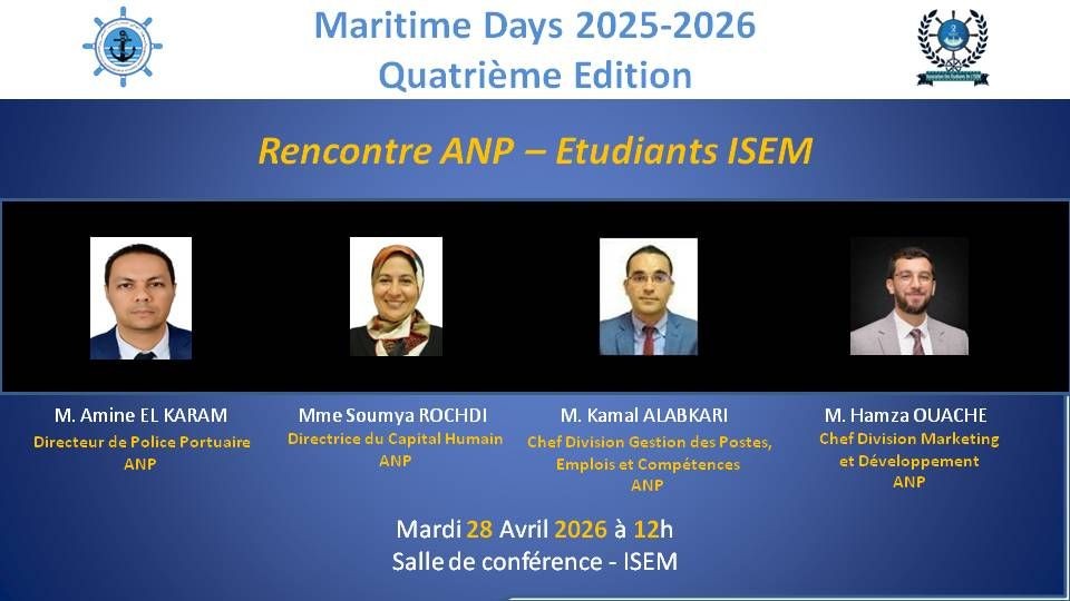 Dans le cadre des Maritime Days 2025-2026, l’Institut Supérieur d’Études Maritimes (ISEM) a accueilli, le mardi 28 avril 2026, une rencontre d’échange entre les représentants de l’Agence Nationale des Ports (ANP) et les étudiants.