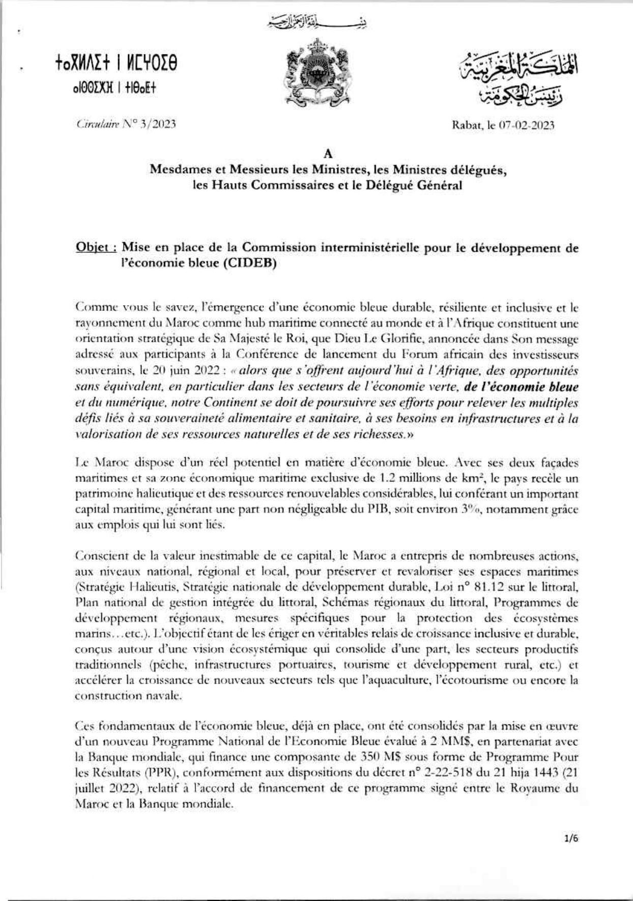 Le Chef du Gouvernement Mr Aziz AKHANOUCH vient d’adresser une circulaire à l’ensemble des Ministres, Ministres Délégués, Hauts Commissaires et le Délégué Général les informant de la mise en place de la Commission Interministérielle pour le développement de l’Economie Bleue (CIDEB).