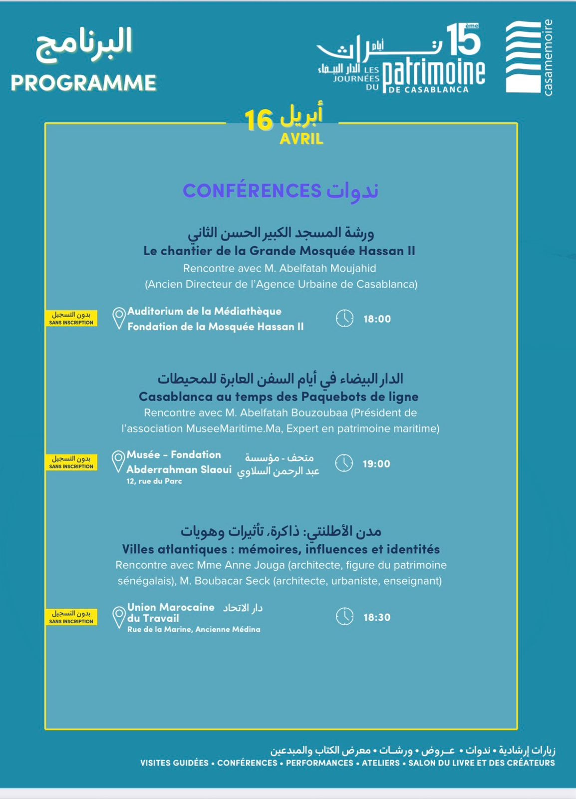 La journée du 16 avril sera marquée par un cycle de conférences réunissant experts, architectes et spécialistes du patrimoine. Parmi les temps forts, une rencontre consacrée au chantier de la Grande Mosquée Hassan II permettra de revenir sur les différentes étapes de réalisation de ce monument emblématique de la ville. D’autres interventions mettront en lumière l’histoire maritime de Casablanca, notamment à travers son rôle durant l’ère des paquebots de ligne, ainsi que les dynamiques culturelles et identitaires des villes atlantiques.