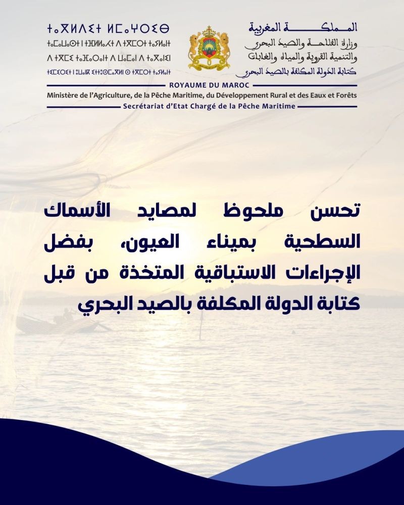 شهدت مصايد الأسماك السطحية بميناء العيون تحسناً ملحوظاً خلال الفترة الأخيرة، نتيجة حزمة من الإجراءات الاستباقية التي اتخذتها كتابة الدولة المكلفة بالصيد البحري.