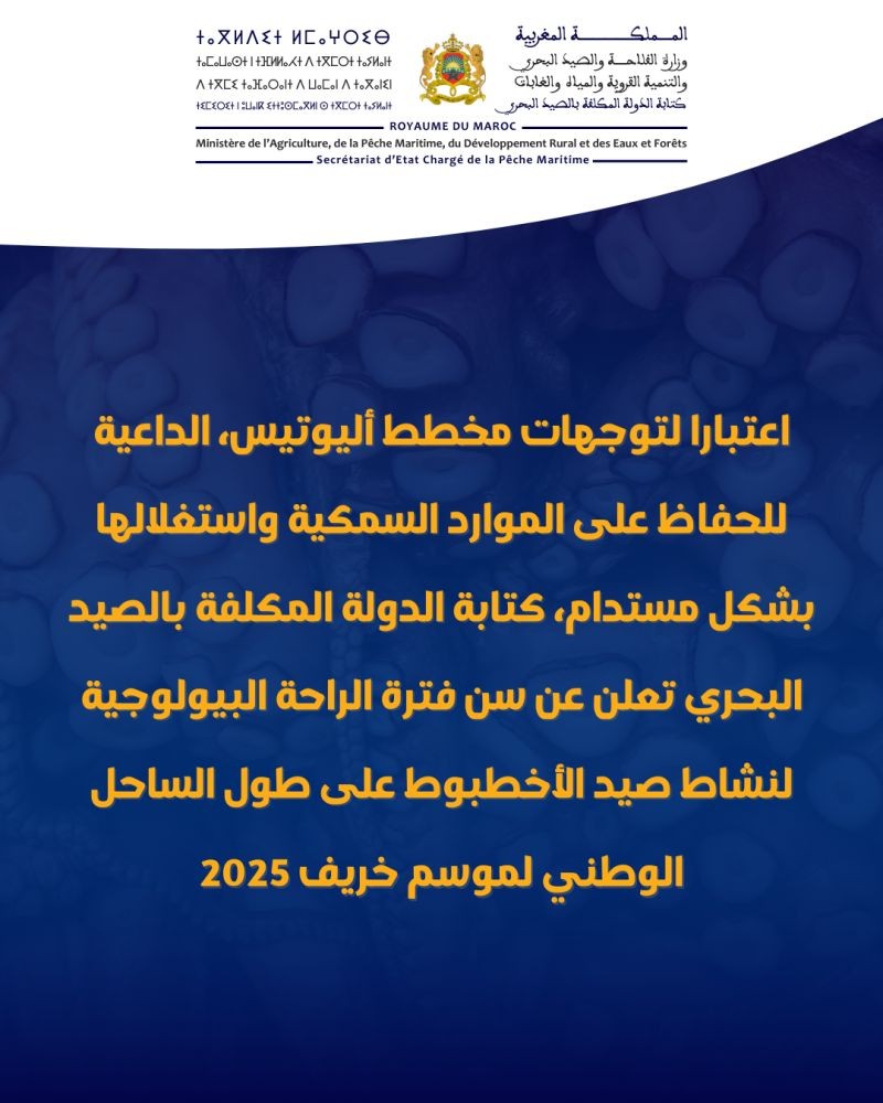 ويأتي هذا القرار بناءً على رأي المعهد الوطني للبحث في الصيد البحري، وفي إطار تنزيل المخطط الوطني لتهيئة مصيدة الأخطبوط، الذي يشكل إحدى الركائز الأساسية للحفاظ على هذا المورد الاستراتيجي وضمان تجديد مخزونه عبر اعتماد فترات منتظمة للراحة البيولوجية.