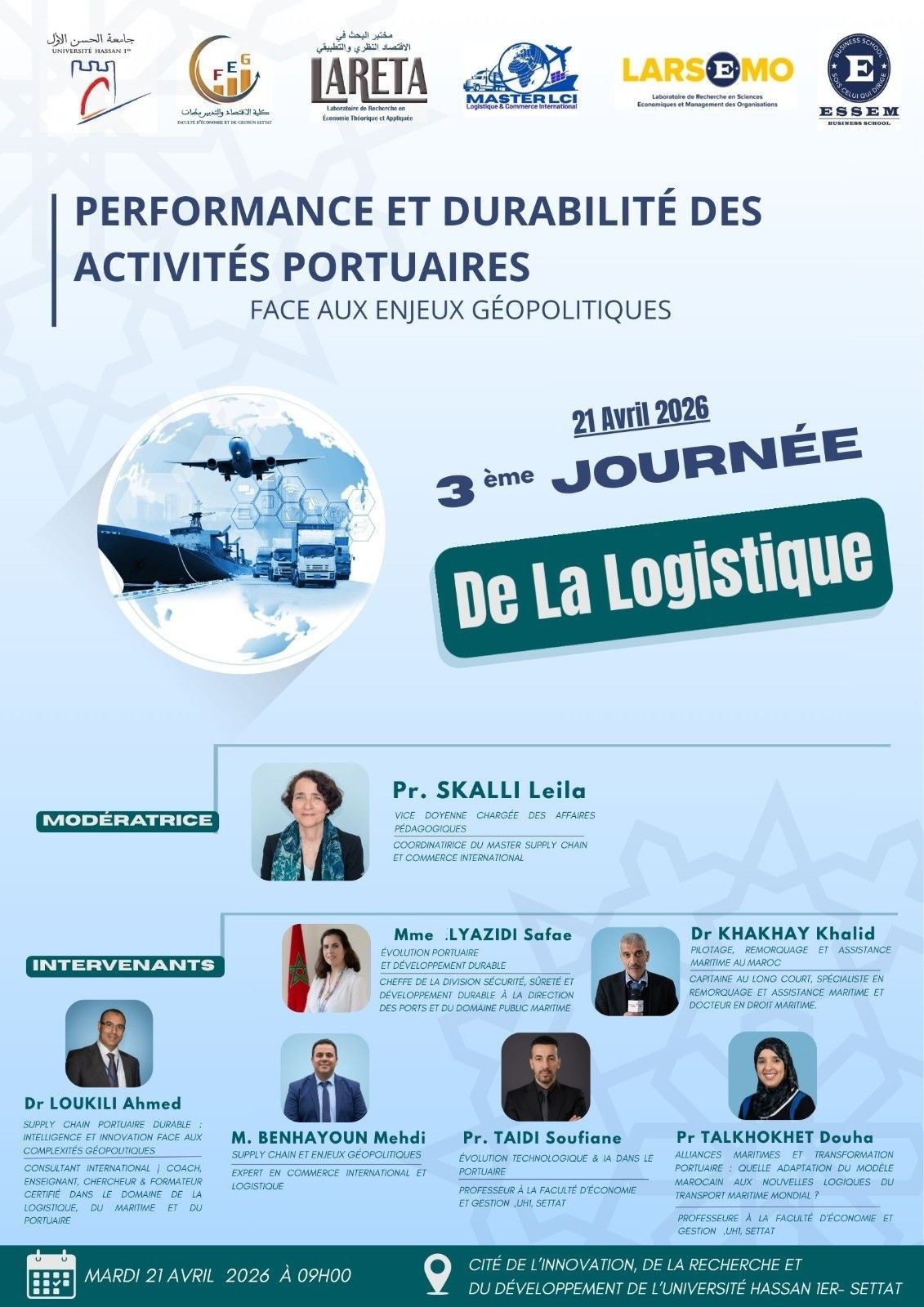 La Faculté d’Économie et de Gestion de Settat accueillera, le 21 avril 2026, une journée d’étude scientifique placée sous le thème : « Performance et durabilité des activités portuaires face aux enjeux géopolitiques ».