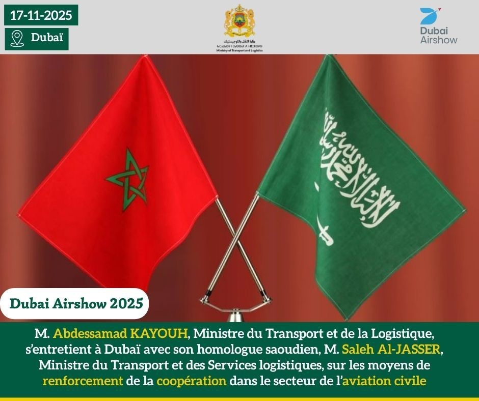 En marge de la 19ᵉ édition du Dubaï Airshow, M. Abdessamad KAYOUH, Ministre du Transport et de la Logistique, s’est entretenu ce lundi 17 novembre 2025 à Dubaï avec M. Saleh Al-JASSER, Ministre saoudien du Transport et des Services logistiques. Les discussions ont porté principalement sur les moyens de renforcer la coopération entre le Maroc et l’Arabie Saoudite dans le domaine de l’aviation civile.