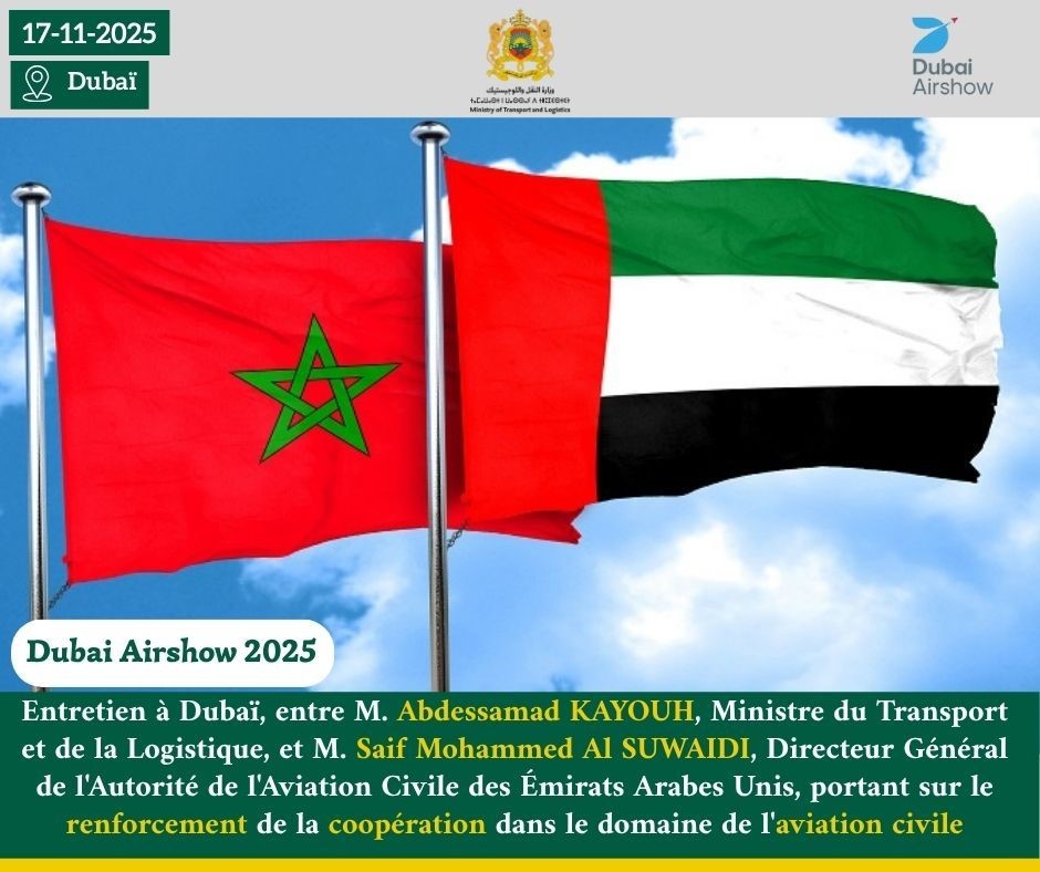 La coopération entre le Maroc et les Émirats Arabes Unis dans le domaine de l’aviation civile a été au cœur des entretiens tenus le lundi 17 novembre 2025 à Dubaï entre M. Abdessamad KAYOUH, Ministre du Transport et de la Logistique, et M. Saif Mohammed Al SUWAIDI, Directeur Général de l’Autorité de l’Aviation Civile des Émirats Arabes Unis (GCAA).