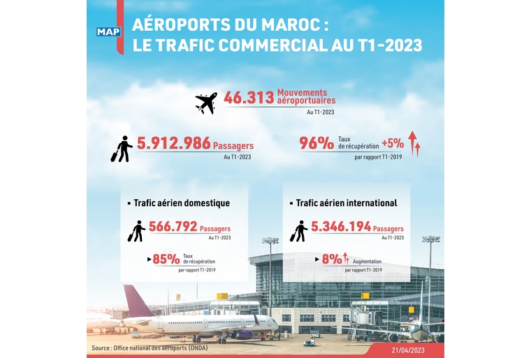 Les aéroports du Royaume ont enregistré, durant le premier trimestre 2023, un volume de trafic commercial de 5.912.986 passagers et de 46.313 mouvements aéroportuaires, soient une évolution du trafic passagers de 5% et un taux de récupération des mouvements d’avions de 96%, par rapport à la même période de l’année 2019, selon l’Office national des aéroports (ONDA).