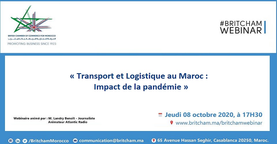 Le Ministère de l’Equipement, du Transport, de la Logistique et de l’Eau a participé à un webinaire organisé, le jeudi 8 octobre 2020 par la Chambre de Commerce Britannique au Maroc, sous le thème : « Transport & logistique : Impact de la pandémie ».