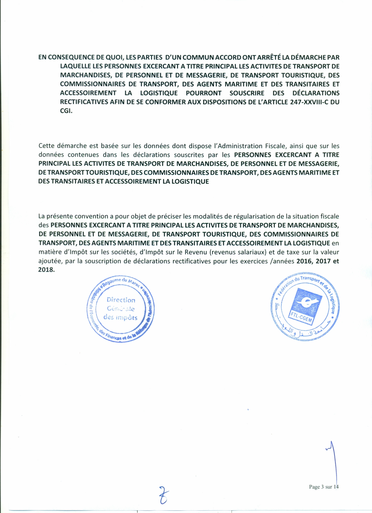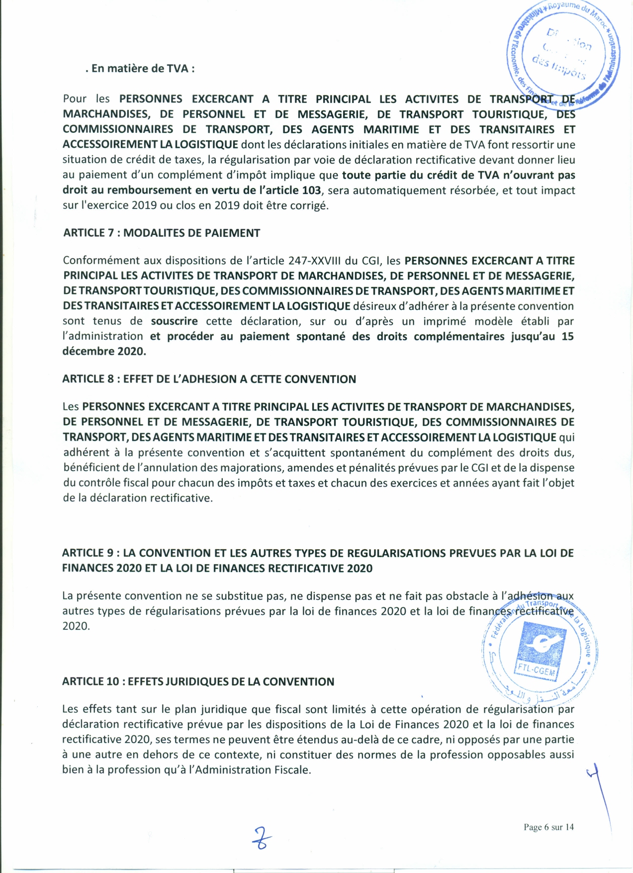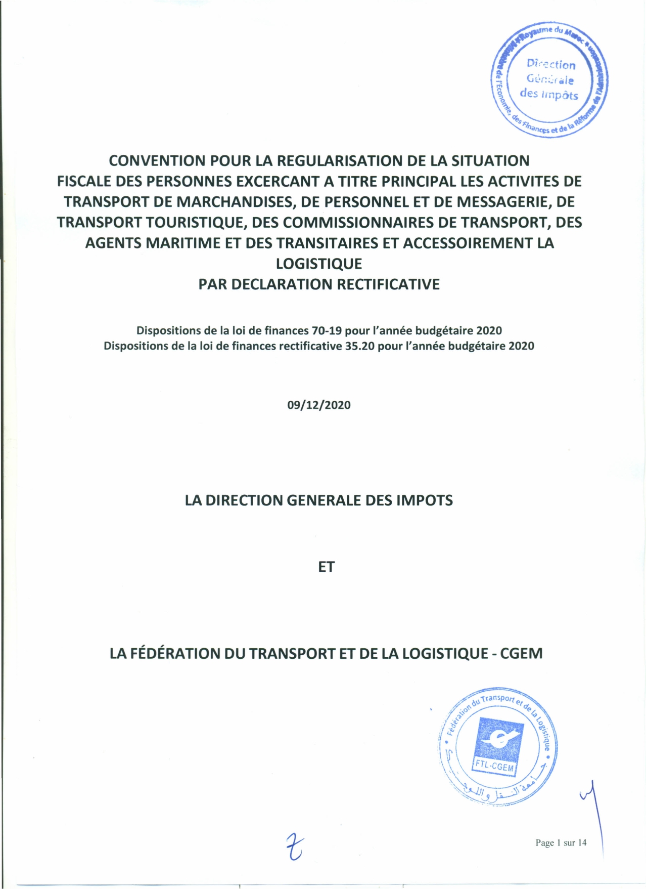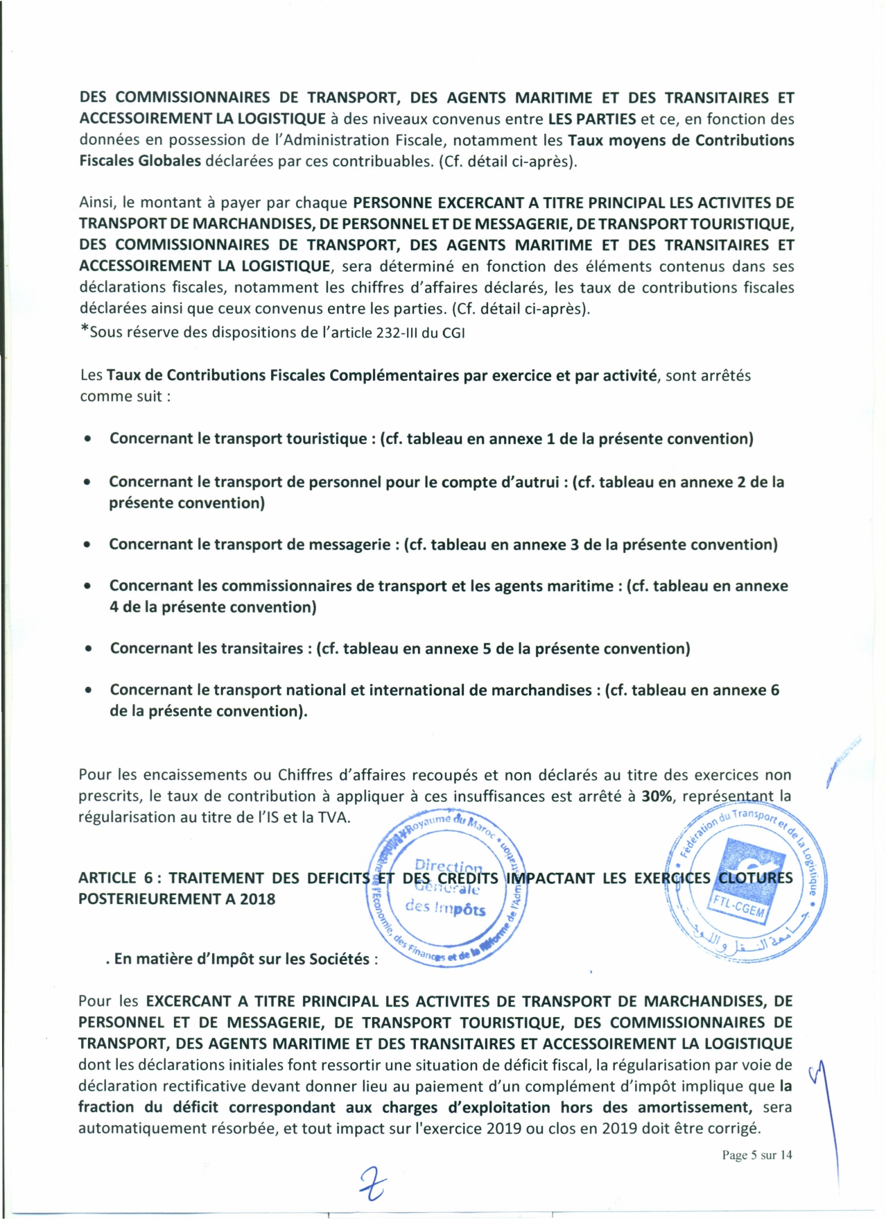 Convention pour la régularisation de la situation fiscale des personnes exerçant à titre principal les activités de transport de marchandises, de personnel et de messagerie, de transport touristique, des commissionnaires de transport, des agents maritimes