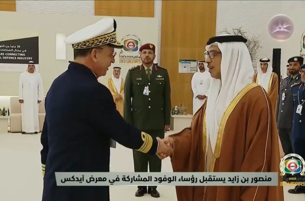 استقبال مفتش البحرية الملكية من طرف الشيخ منصور بن زايد نائب رئيس الوزراء مدير الديوان الرئاسي الاماراتي خلال ترأسه حفل افتتاح معرض الدفاع الدولي بأبوظبي أيديكس و نافديكس