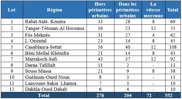A cet effet, le Ministère a lancé un appel d’offres relatif à l’acquisition, l’installation et la maintenance de 552 appareils de contrôle et de détection automatique des infractions du Code de la Route, répartis comme suit :