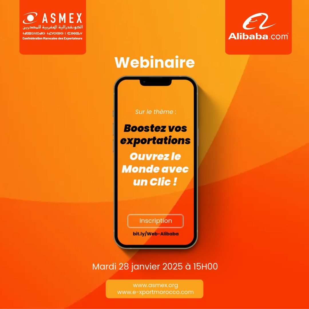 Dans un monde de plus en plus connecté, les outils digitaux sont devenus des leviers essentiels pour atteindre de nouveaux consommateurs et acheteurs à l’échelle mondiale. Dans ce cadre, l’ASMEX (Confédération Marocaine des Exportateurs) et Alibaba.com unissent leurs forces pour organiser un webinaire exclusif destiné à aider les entreprises marocaines à maximiser leur potentiel d'exportation en ligne.