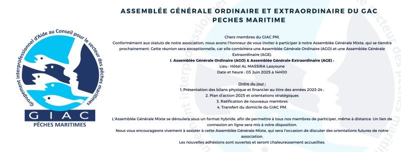 Le Groupement Interprofessionnel d’Aide au Conseil pour les Professions Maritimes (GIAC PM) organise une Assemblée Générale Mixte (Ordinaire et Extraordinaire) le mardi 3 juin 2025 à l’hôtel Al Massira de Laâyoune, dans un format hybride permettant la participation à la fois en présentiel et à distance.