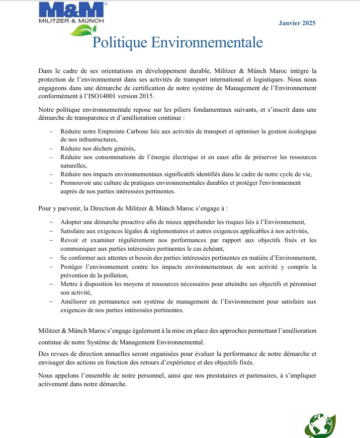 Réfléchir en Bleu, agir en Vert, tel est le mot d’ordre adopté par les équipes de Militzer & Münch Maroc. Une philosophie qui se traduit par des actions précises : optimisation des itinéraires, réduction des émissions, sensibilisation interne, choix de partenaires engagés, et gestion responsable des ressources.