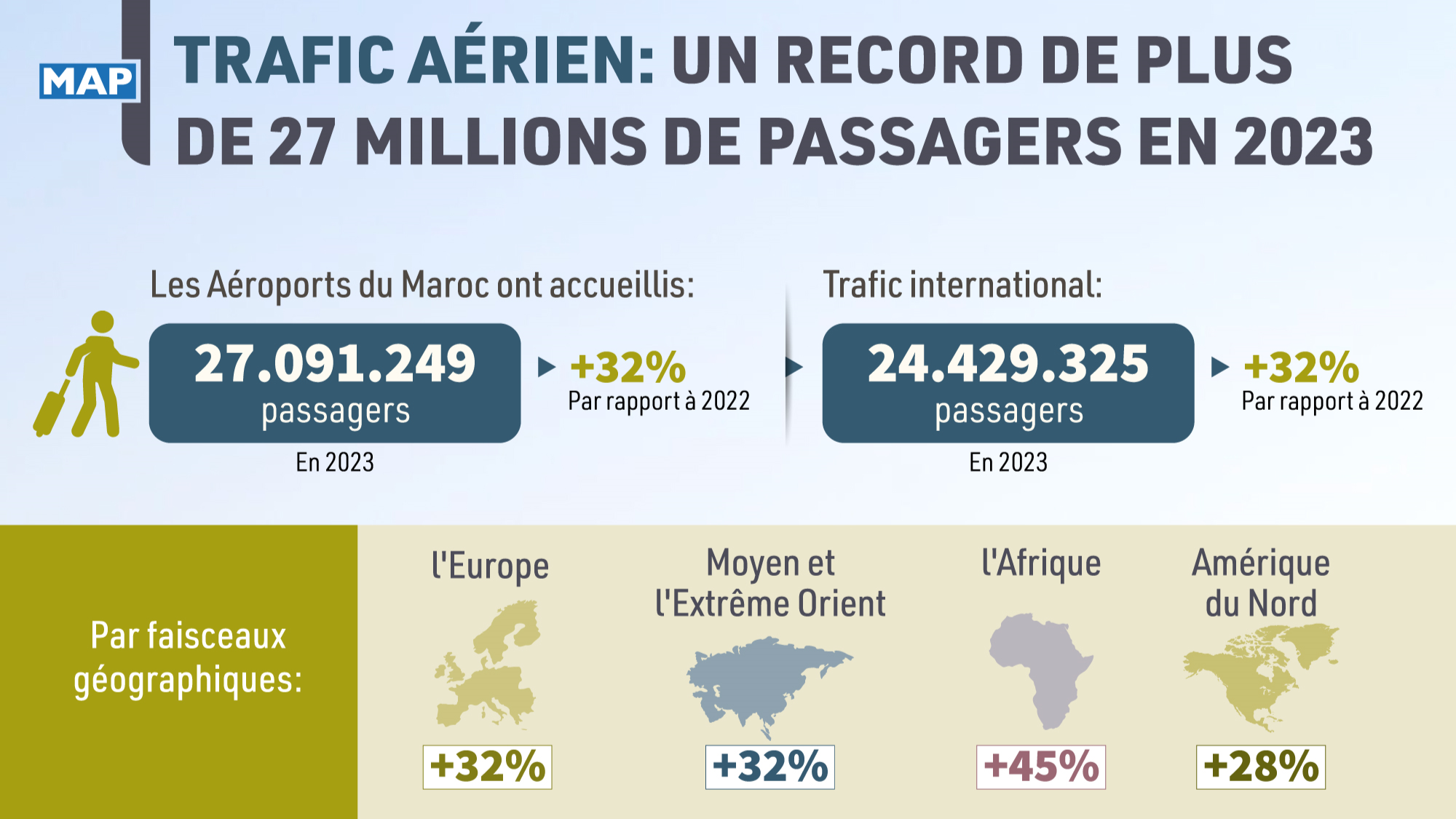 Cette croissance a été portée par le trafic international, qui a connu une hausse de 32% par rapport à l'année 2022, en s’établissant à 24.429.325 passagers accueillis, indique l'ONDA.