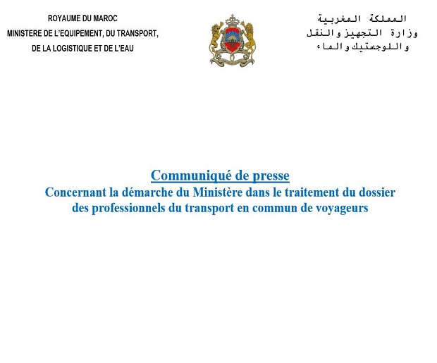 A la lumière des différentes conclusions du processus de dialogue entre le Ministère de l’Equipement, du Transport, de la Logistique et de l’Eau (METLE) et les professionnels du transport en commun de voyageurs, et notamment les dossiers en suspens qui seront traités par la Commission du Transport, le Ministère porte à la connaissance de l’opinion publique nationale, et particulièrement des professionnels du transport en commun de personnes au Maroc, que ladite Commission a entamé, depuis le début de l’année 2019, la tenue de ses réunions périodiques et régulières afin de traiter l’ensemble des dossiers reçus de la part des professionnels, et de les examiner conformément aux procédures juridiques et réglementaires en vigueur, y compris les dossiers relatifs au transport touristique, au renouvellement septennal et au transport mixte.