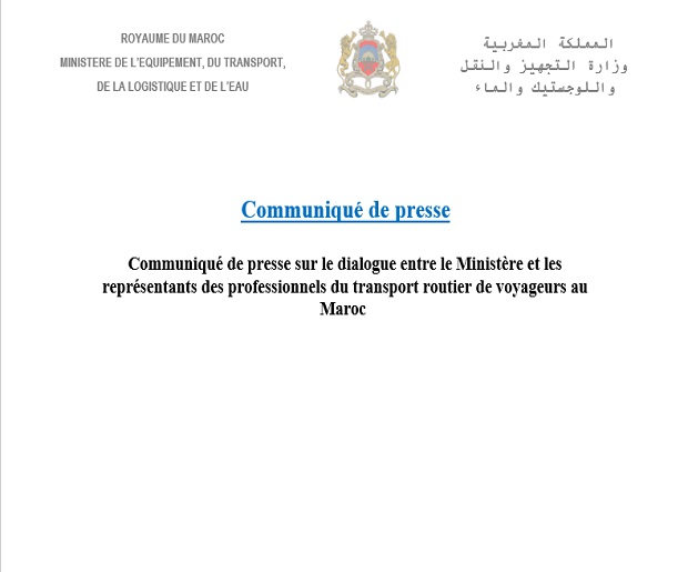 Communiqué de presse sur le dialogue entre le Ministère et les représentants des professionnels du transport routier de voyageurs au Maroc