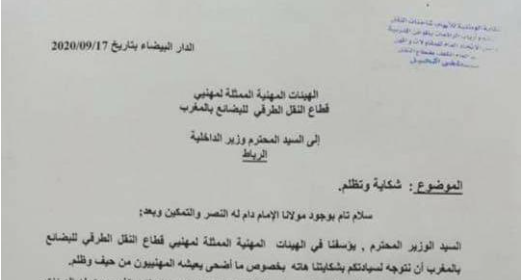 السيد الوزير المحترم، يؤسفنا في الهينات المهنية الممثلة لمهني قطاع النقل الطرقي للبضائع بالمغرب أن نتوجه لسيادتكم بشكايتنا هاته بخصوص ما أضحى يعيشه المهنيون من حيف وظلم.