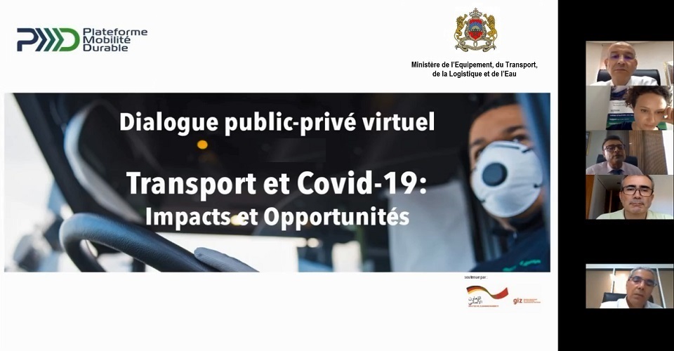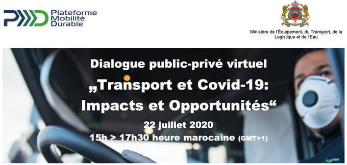 Le Ministère de l’Équipement, du Transport, de la Logistique et de l’Eau et la Plateforme Mobilité Durable (PMD) ont conjointement organisé, le 22 juillet 2020, un webinaire intitulé « Transport et Covid-19 : Impacts et opportunités » sous forme d’un dialogue virtuel public-privé portant sur les impacts, les réponses et les opportunités pour le transport de marchandises et de personnes post-Covid-19 au Maroc.